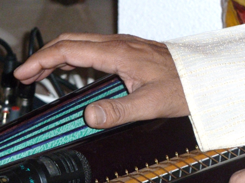 Het Indiase Harmonium wordt anders bespeeld dan een westers Harmonium. Met de rechterhand worden de toetsen ingedrukt en met de linkerhand wordt de lucht door de rietjes geblazen. In India is de muziekopbouw zò, dat alletonen achter elkaar gespeeld worden en niet tegelijkertijd.